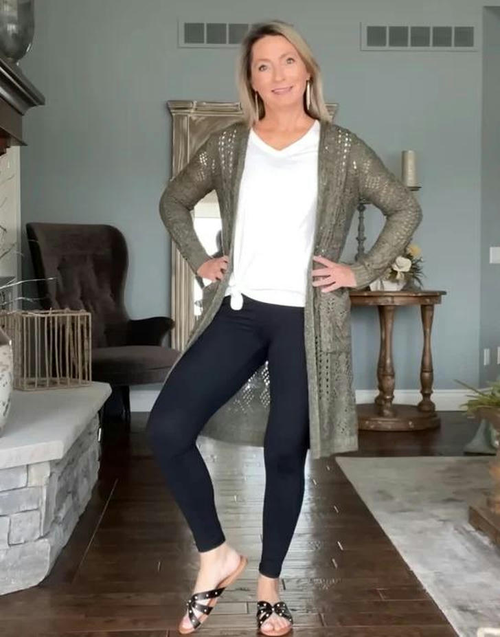 For a relaxed, summer feel, slide into a pair of trendy slides. They pair beautifully with the cardigan, offering a laid-back yet stylish look.