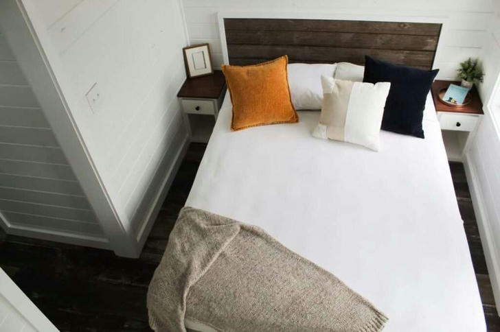 Derrière la cuisine se trouve une chambre confortable. Elle n'est pas très spacieuse, mais elle peut accueillir deux tables de nuit et un lit double. Heureusement, la grande fenêtre contribue à atténuer la sensation d'exiguïté.