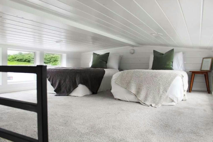 Dans le loft, vous trouverez deux lits simples et un tapis gris moelleux recouvrant le sol. L'espace entier est doux et chaleureux, avec la lumière du soleil qui entre par les fenêtres. C'est un endroit parfait pour que les invités se reposent ou passent la nuit.