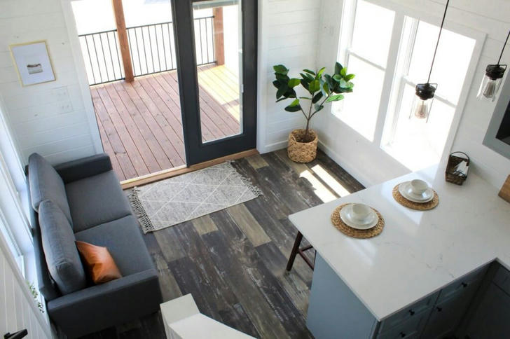 Det huvudsakliga vardagsrummet i detta lilla hus har ett kök och vardagsrum i full storlek. En fransk dörr välkomnar dig vid entrén. En del av köksbänken fungerar som ett matbord och blandar praktiskt med charm.