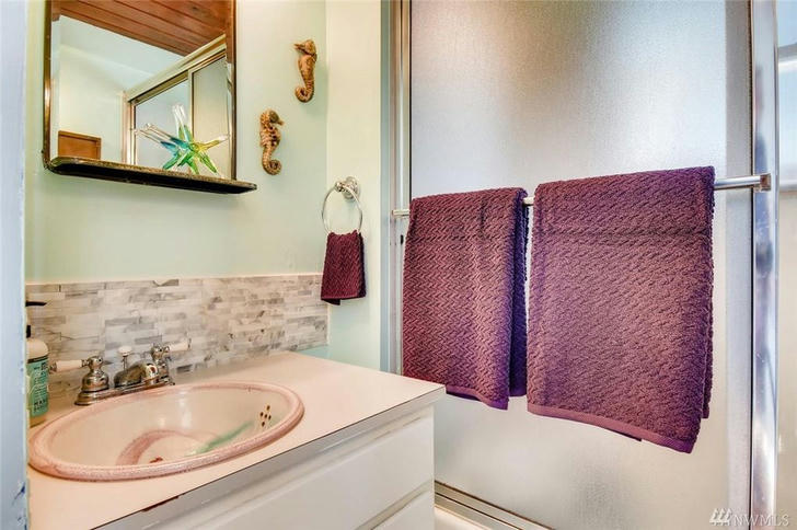 The ocean-inspired bathroom in this houseboat is your personal oasis for relaxation. Compact yet stylish, it features soothing gray-green walls, a sleek vanity with a sink and mirror, a toilet, and a cool walk-in shower that doubles as a bathtub. Plus, the wet and dry areas are separated, so showering is worry-free!