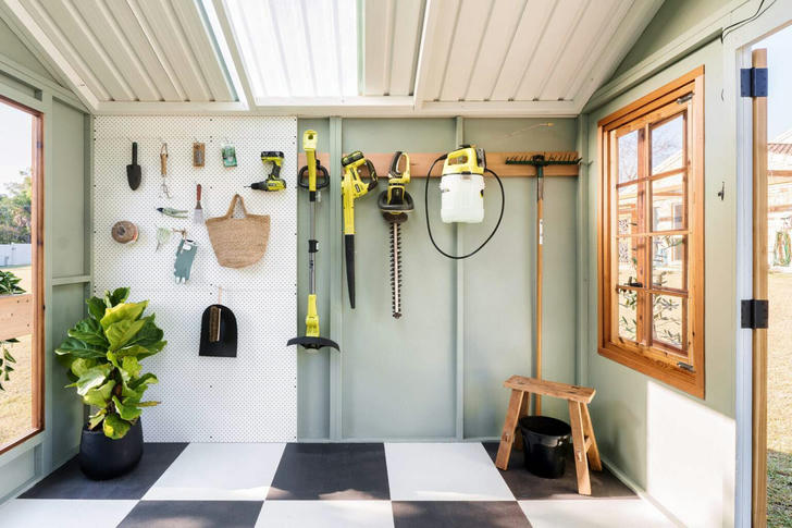 Inside, the shed’s design is as practical as it is stylish. A clean pegboard wall keeps tools neatly displayed and easily accessible, perfect for gardening enthusiasts or DIY projects. From trowels to trimmers, every item has its place, ensuring that the space stays organized and clutter-free.
