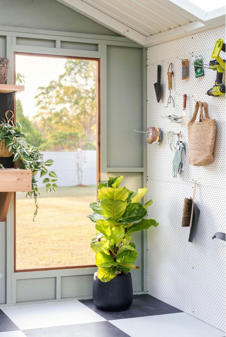 This close-up highlights the thoughtful details that make this shed both functional and inviting. The pegboard corner is carefully arranged, showcasing a mix of essential tools and decorative touches like a woven basket, blending utility with style. It’s a setup that feels organized yet relaxed, encouraging creativity without the stress of searching for supplies.
